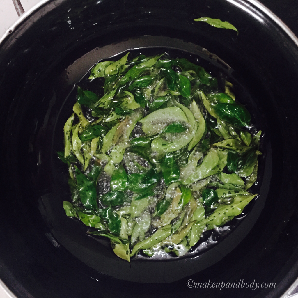 - Now boil the coconut oil in a pan and add half cup curry leaves in it.