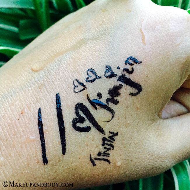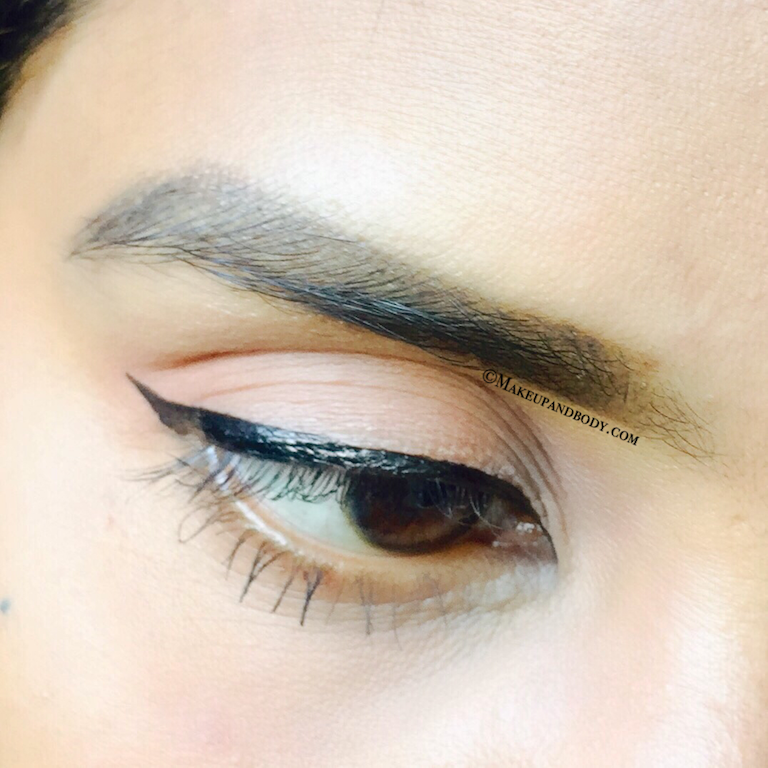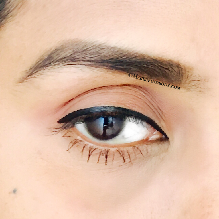 The texture of this eyeliner is very smooth but not too runny. It has a very smooth soft texture, which easily glides on eyes without tugging. It dries down just in few seconds and gives a semi-matte finish look. It doesn’t peel off like any other eyeliner and stays put on my eyelids at least 7-8 hours which is a quite decent staying power and after that, it starts fading a little bit but it doesn’t smudge. About its waterproof claim, it is not 100% waterproof. The eyeliner doesn’t come down or smudge when you splash water on to your face, It stays intact unless you rub it with your hands and then it fades completely. But then the best part is that it is very easy to remove it using just water and soap.