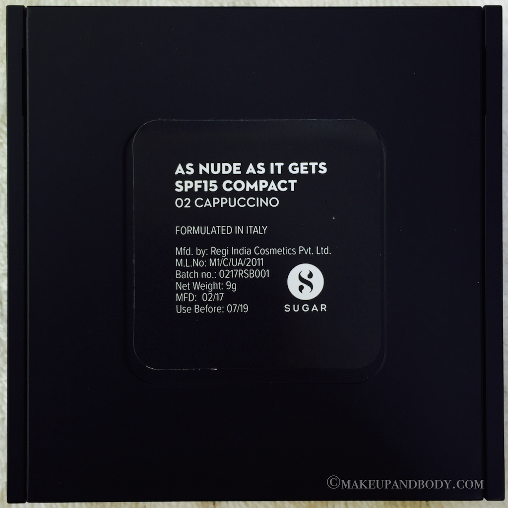 Sugar Cosmetics As Nude As It Gets SPF 15 Compact in 02 Cappuccino comes in a matte finish square black case. It comes enclosed in a beautiful cardboard box with their usual Sugar graphical prints where all the necessary details are mentioned including the shade name and ingredient list. The case lid has the Sugar Cosmetics Logo printed on it, which looks absolutely elegant. At the back of the case, the product name & shade is printed too. It comes with a mirror and an applicator sponge for easy application. The mirror is quite wide which I really like. The case has a magnetic closure which shuts with a click sound thus it’s very sturdy and travel-friendly. Overall I absolutely love the packaging.